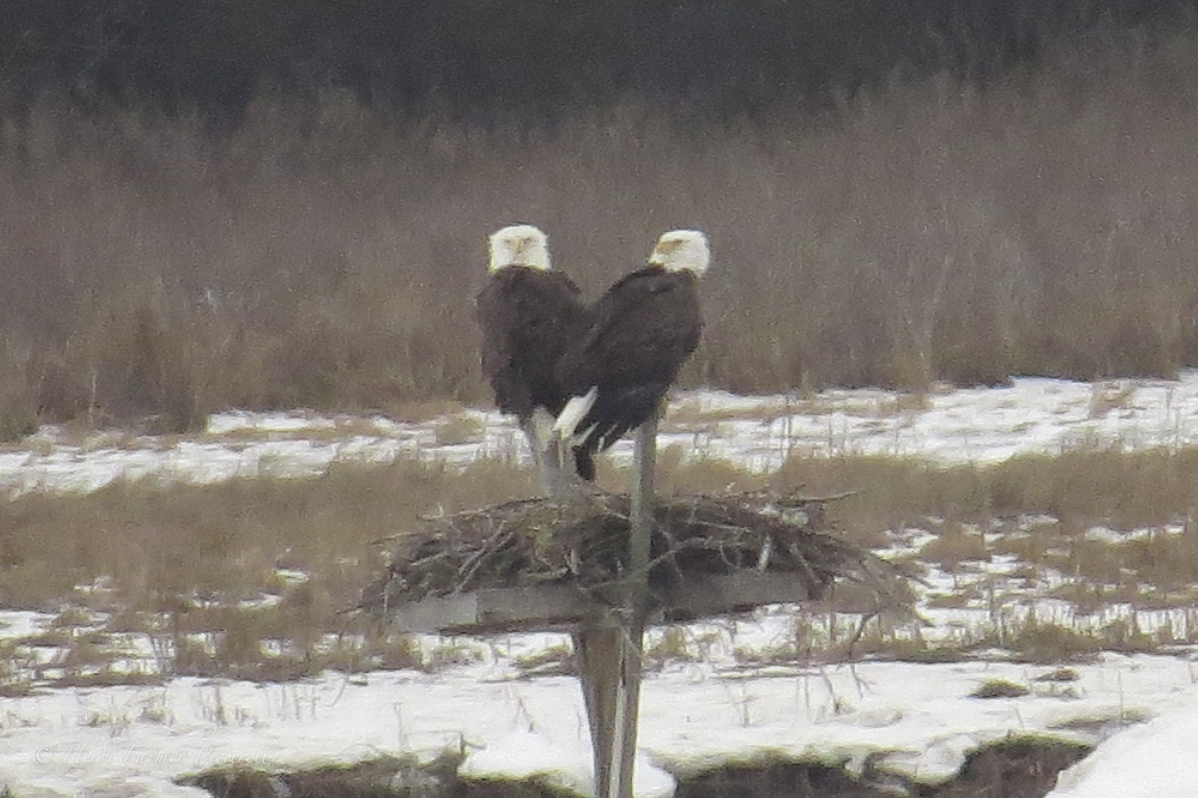 I received a call from my bother in-law that a friend of his had just driven by the Cove and saw what she thought was an Eagle in an Osprey nest. Eagles were not commonly seen locally, although they had inhabited the area for several years. He had recently purchased a house on the water over there, so I knew I would be able to at least see it from his house at a far distance. I didn’t have a fancy zoom lens at the time, but grabbed my Canon SX50 pocket camera which has a remarkable ability to reach long distances.