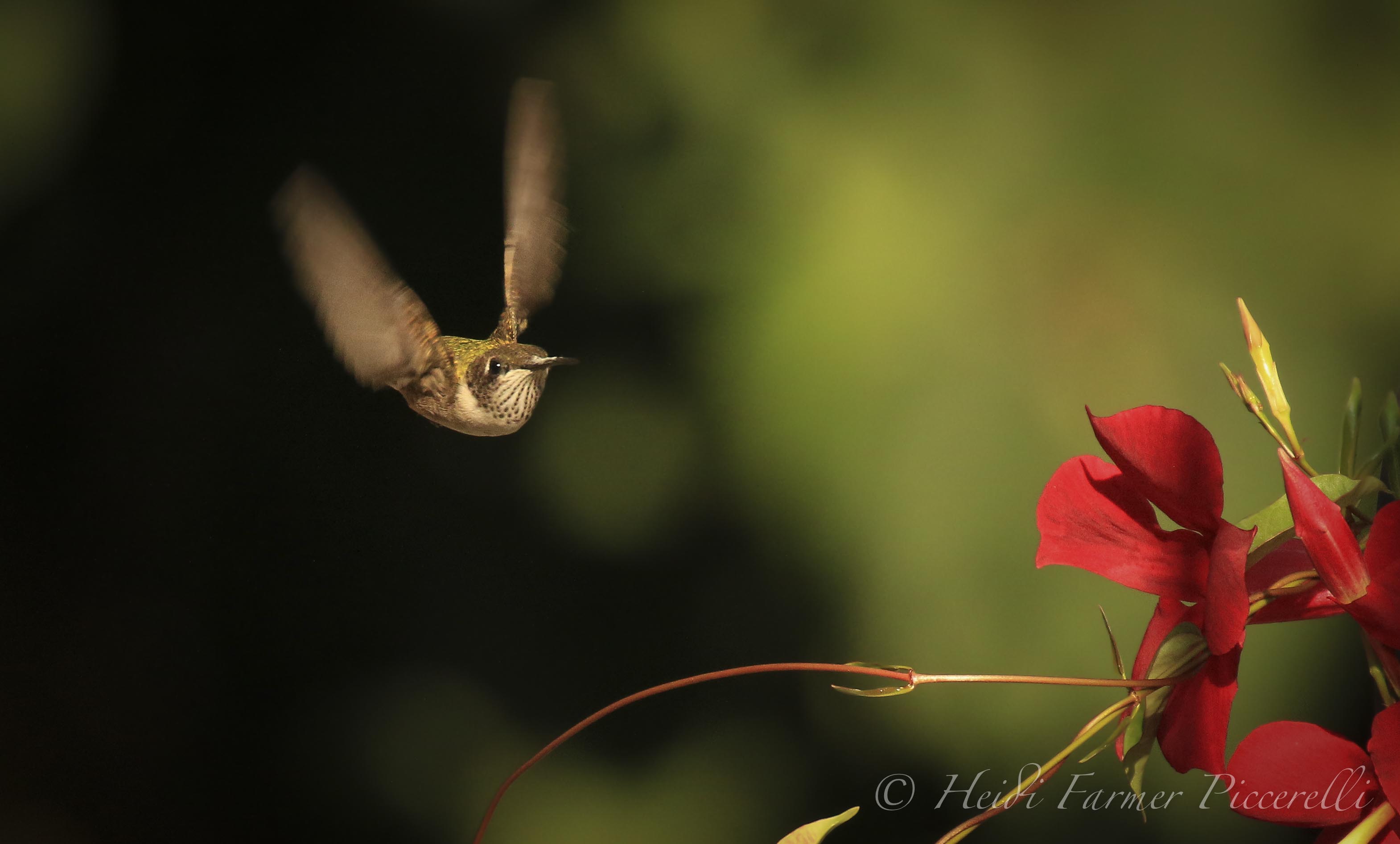 This morning, in thinking about which story to tell next, the thought of the Hummingbird came to mind. The minute I walked out into the backyard I was buzzed by one, two, then a third Hummingbird who all circled above my head as if they were saying “Pick me! Pick me!” I went and grabbed the camera hoping they’d still be somewhere in the yard when I returned. Usually we see them at the feeder and I am able to catch them them in flight if I wait long enough.
