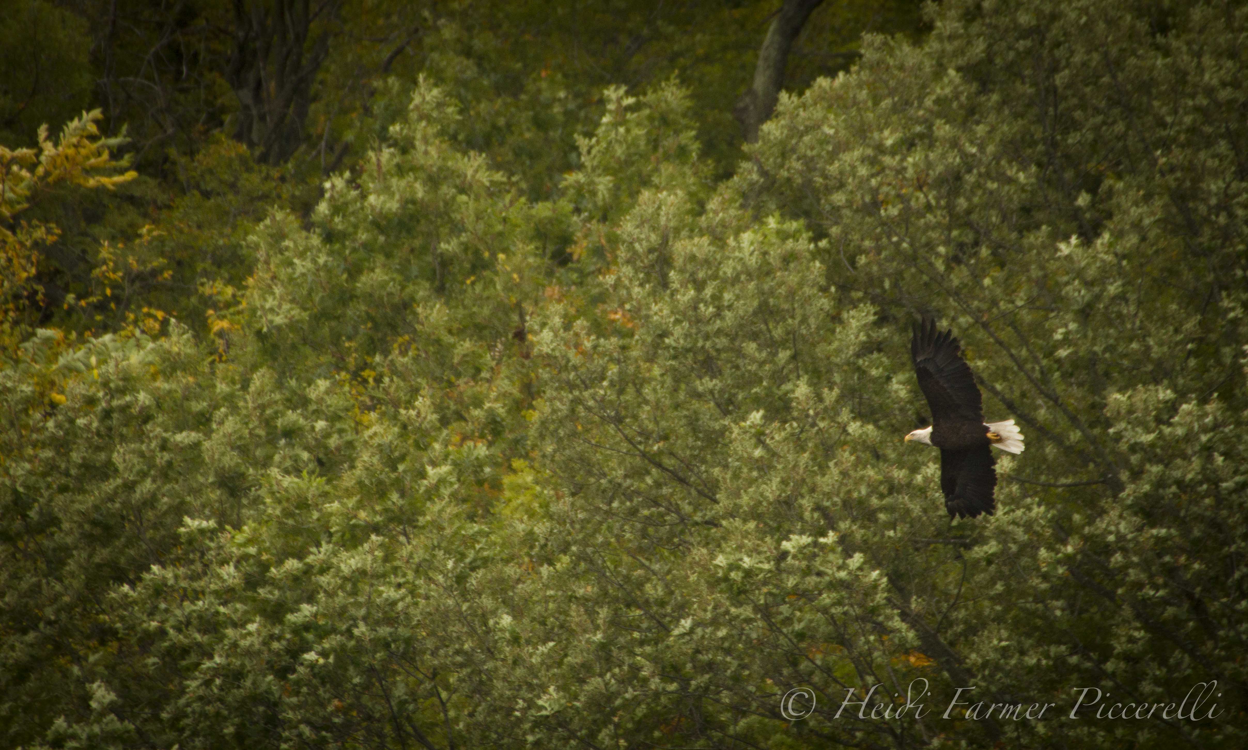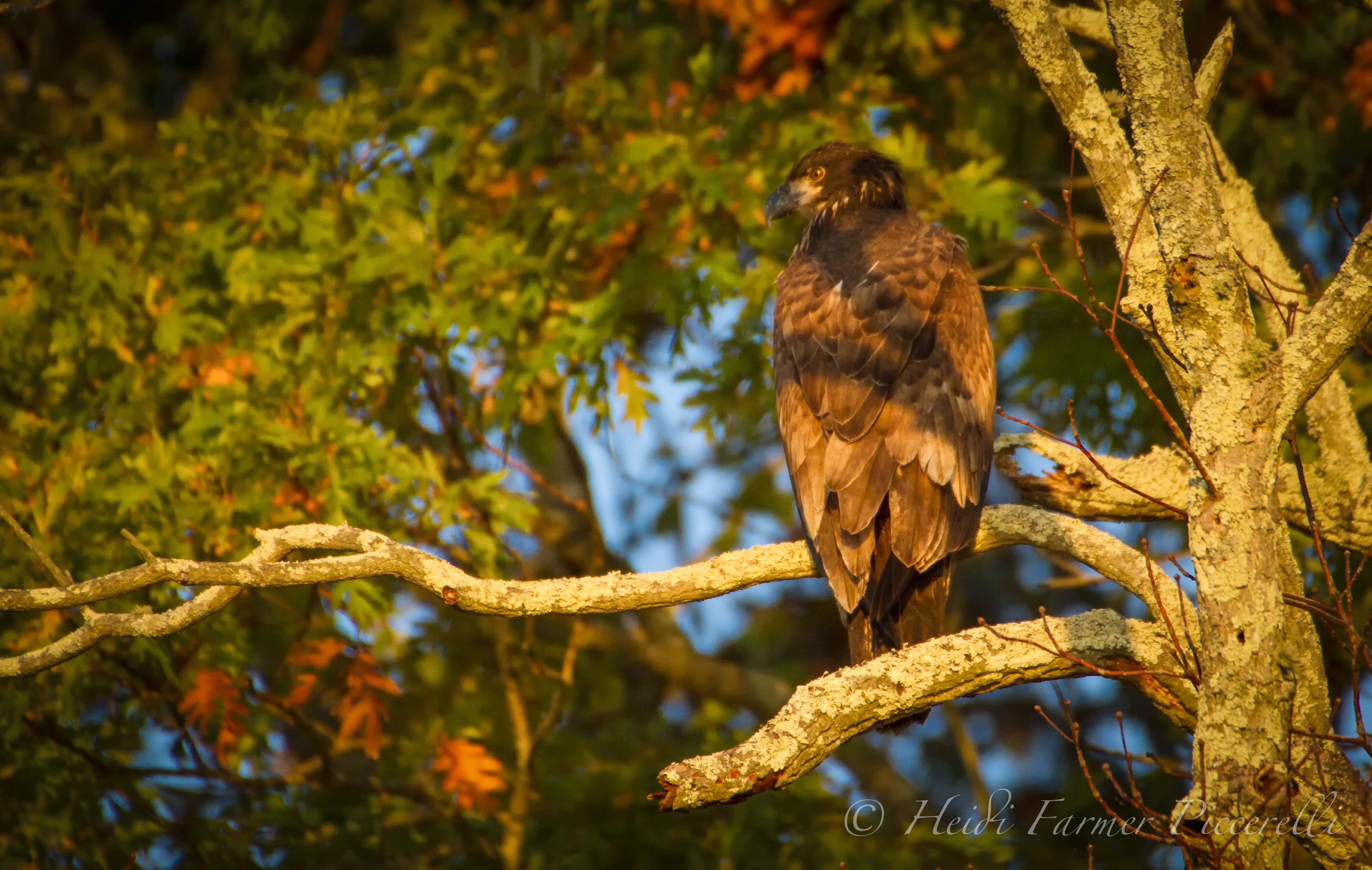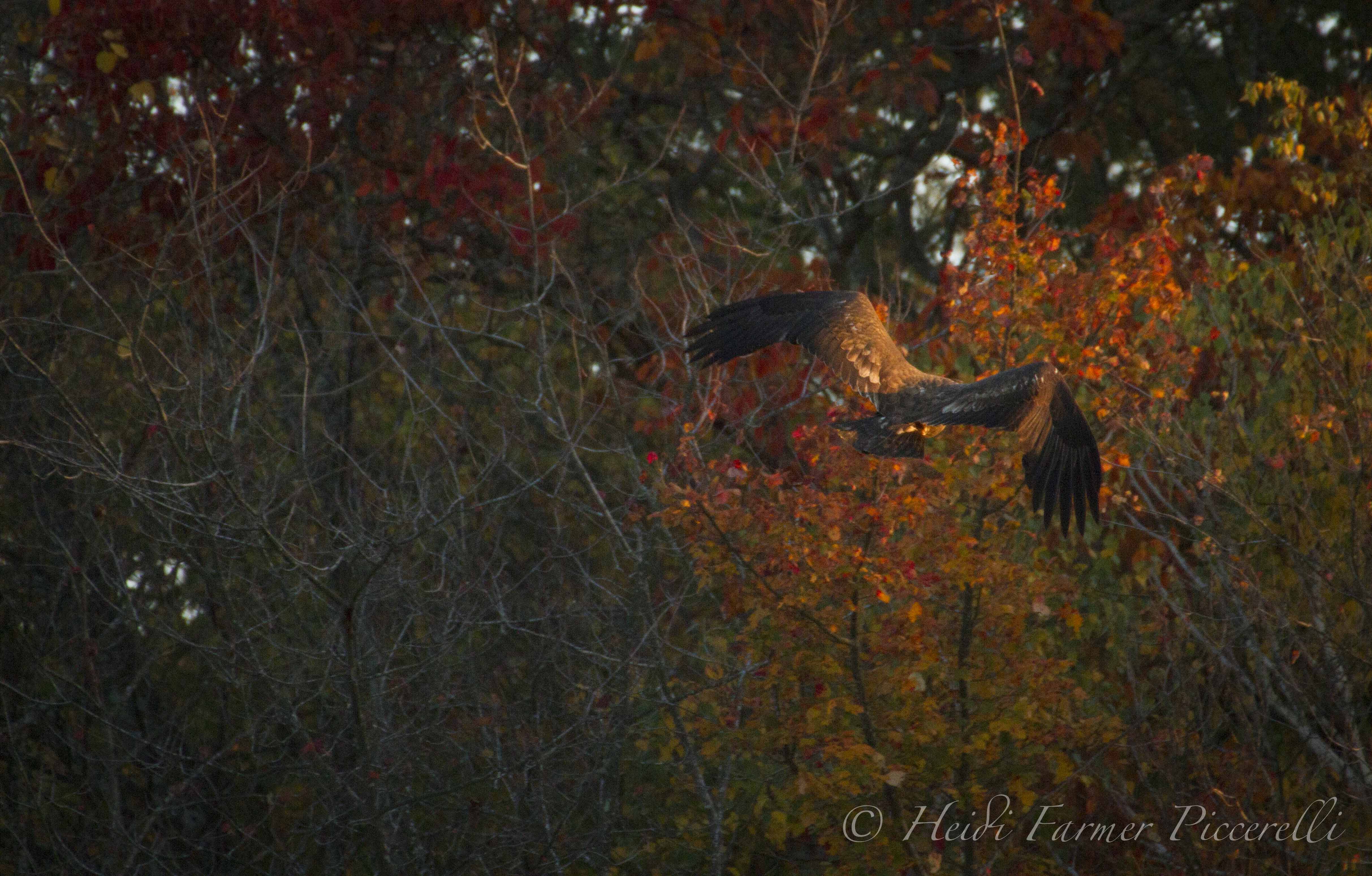 This Juvenile Eagle, as if on cue, flew straight into the patch of changing leaves just as Mother Nature used her magic wand to splash some of the sun’s last bit of light onto its wing.