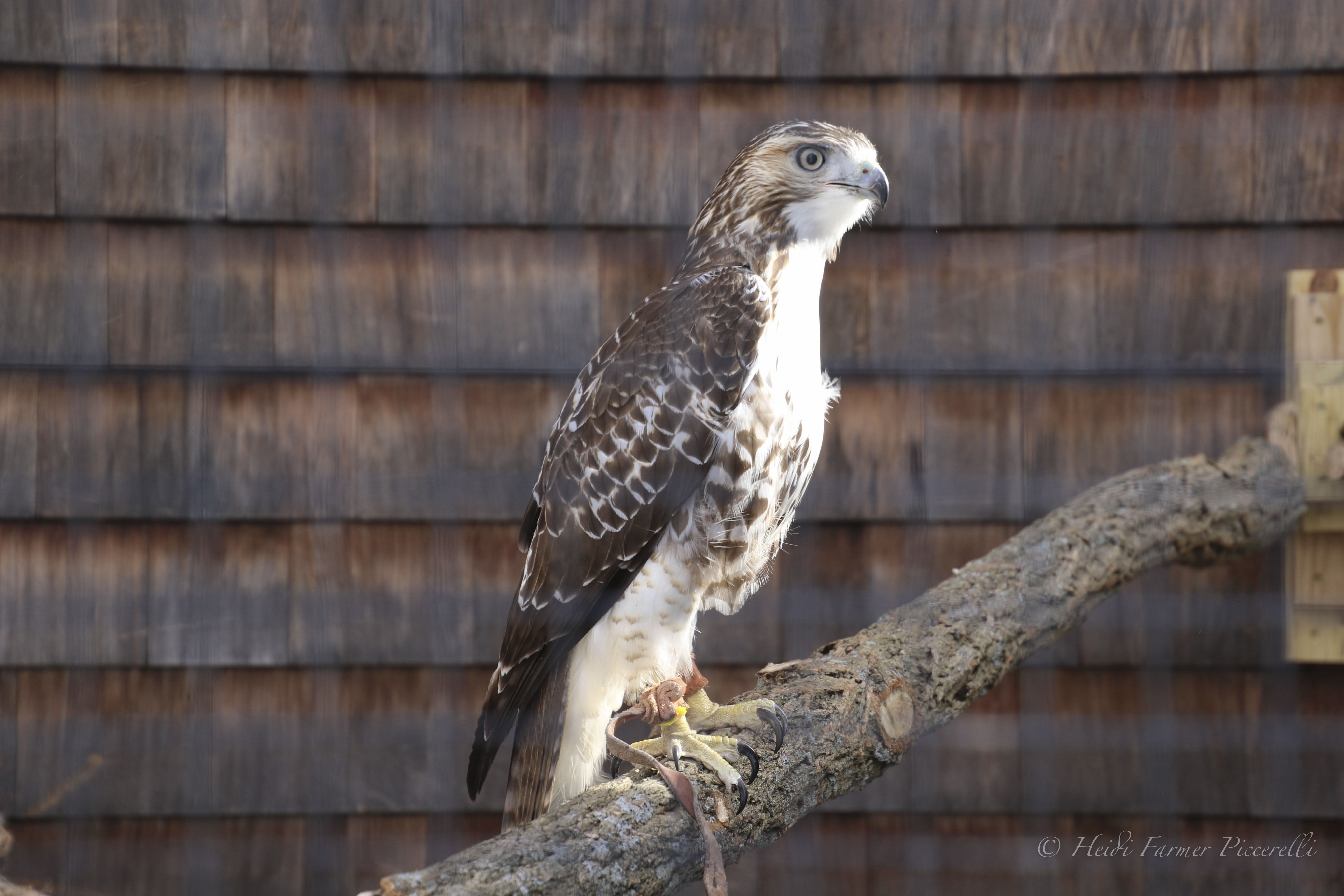 This juvenile Red-tailed Hawk was found on the road by a passerby who called “Christine’s Critters” in Weston, CT. David, one of their volunteers, picked it up & brought it to Falconer & Wildlife Rehabilitator Christine Peyreigne who took it in and rehabilitated it with David’s help. Christine contacted the Audubon Society of Rhode Island to inquire about the possibility of taking it in as a permanent resident on one of the Audubon’s many refuges once it was fully rehabilitated. This happy transfer took place on January 19, 2016. – Heidi Piccerelli YouTube